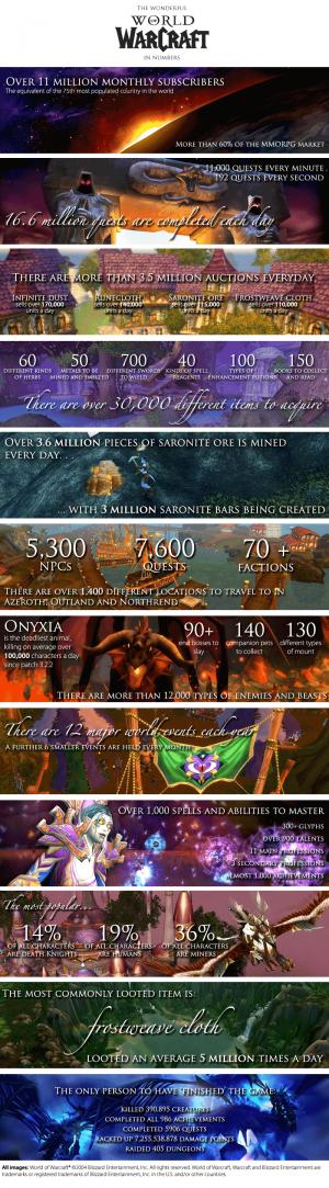 Le jeu propose également plus de 5 300 personnages non joueurs, 7 600 quêtes, plus de 70 factions et 12 000 monstres. Le plus meurtrier est Onyxia qui tue 100 000 joueurs / jours depuis sa réapparition dans le patch 3.2.2.