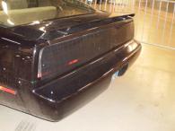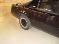 Le premier regard suffit pour se rendre compte qu’il s’agit de K.I.T.T. et pas "juste" d’une Pontiac Firebird classique : C’est bien sûr le pare-chocs avant spécifique avec l’emplacement pour le scanner rouge au milieu qui nous rappel de quoi ou plutôt de qui il s’agit. Notons ici que celui-ci est issu de la quatrième saison, puisqu’il forme une surface plane avec le capot et n’a pas de caches pour les clignotants d’origine. En outre, on retrouve les jantes alu "TurboCast" en 15 pouces avec les enjoliveurs "Bowling", l’aileron de la Trans Am de 1982 et les feux arrières recouverts de plexiglas teinté. Autre détail plaisant : la plaque d’immatriculation "California Knight" avec le cadrant en métal chromé.