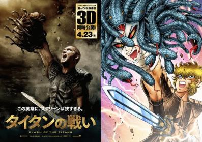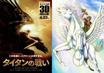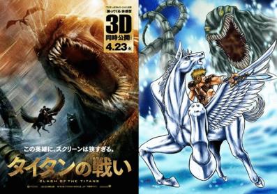 Masami Kurumada s’est amusé à redessiner les affiches originales du film du Choc des Titans avec son design. Le résultat est assez particulier. Le brun mais à la chevelure quasiment rase Sam Worthington devient blond avec une belle crinière. Le pégase noir dans le film devient blanc…
