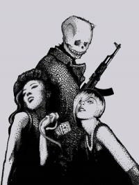 - Icon représentant le personnage principal dans une position clichée avec une arme et des belles femmes. Ce dessin est réalisé en pointillisme en utilisant le symbole de dollars $. (premier dessin ci-dessous)