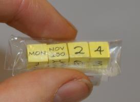 La particularité du bibelot est de permettre à l’utilisateur d’indiquer le jour courant. Pour cela, il y a 4 encoches qui permettent de poser les 4 pierres servant de calendrier. La première reprend le trigramme anglais des jours (MON, TUE, …), la seconde le trigramme des mois (JAN, FEB, …) et les deux dernières sont des chiffres permettant de numéroter le jour courant.