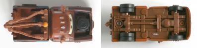 Matériaux : Le châssis, la structure du treuil et les roues sont en plastique dur, les câbles du crochet et les rétroviseurs sont en plastique souple. Quant à la carrosserie, elle est en métal et elle est fixée au châssis grâce à des poinçons, il n’est donc pas possible de démonter l’ensemble.