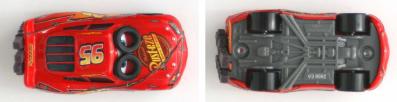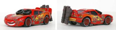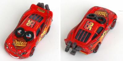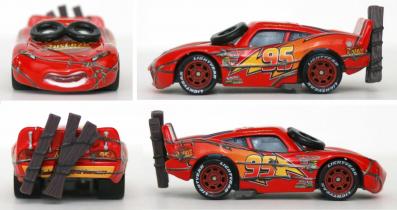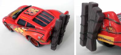 A première vue, le moulage à l’air identique à celui du Flash McQueen normal, tout au plus, on peut penser que quelques trous ont été percés pour fixer les piquets et les deux pneus.