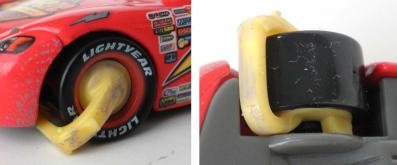 Ce jouet tiré du film Cars représente Flash McQueen lorsqu’il se retrouve à la fourrière avec un sabot à cause des dégâts qu’il a causé à Radiator Springs.