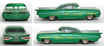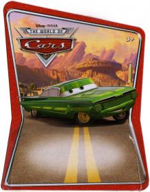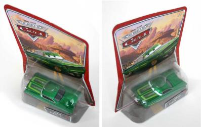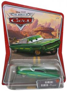 Ce jouet tiré du film Cars représente Ramone vers le début de l’histoire, après que le procès de Flash McQueen ait eu lieu. Comme Flash a rayé sa peinture avec le barbelé, Ramone va se repeindre et il décide alors de changer d’aspect en passant du violet avec flammes à cette couleur verte.