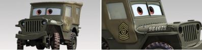 Sarge ou Sergent est un personnage inspiré d’une Jeep Willys de 1942 qui avait été utilisé dans le Seconde Guerre Mondial. Sa peinture verte kaki est ornée de motifs représentant les insignes qui traduisent le grade dans l’armé américaine : Sergent Major. Or « Sergent » en anglais se dit « sargeant » d’où le nom du personnage : Sarge qui en est le diminutif.
