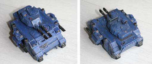 Les canons latéraux peuvent être soit des bolters lourds soit des lasers, ils sont suspendus sur un axe qui leur permet théoriquement de tourner horizontalement et verticalement. Il est regrettable que cet axe soit particulièrement fin et fragile car il se casse très facilement si vous le manipulez.