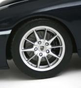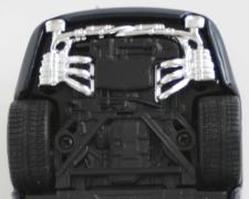 Malgré la bonne finition de cet objet, il n’est pas exempt de points faibles. Tout d’abord, le moteur tout comme le coffre avant sont moulés d’une seule pièce. Même si le moulage est fin, ça se voit un peu trop et c’est vraiment dommage. Alors que les charnières des portières sont assez discrètes, celle du capot et du coffre avant est très massive et peu esthétique, l’avantage, c’est que c’est solide. Le pot d’échappement est chromé tout le long, ce qui est assez criard, il aurait été plus réaliste d’avoir la même teinte que les jantes.