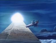 L’explosion enlève la vase sans détruire la pyramide qui était enterrée dessous. Albator est étonné de trouver une architecture de type Egyptien si près du Mexique. Cette pyramide est d’autant plus curieuse que les inscriptions gravées dessus sont de type précolombien et non de type Egyptien. Il s’agit du même alphabet que celui utilisé sur la sphère noire (voir épisode 4).