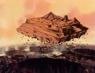 Le tremblement de terre est provoqué par le décollage de l’'ancien temple en pierre.Les constructions de pierres qui servaient de camouflage s’effondrent à leur tour et laissent apparaître la coque métallique du vaisseau.