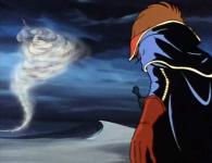 Albator continue sa route en titubant sous une chaleur écrasante (visiblement il a jamais appris que le noir accumule la chaleur car il n’a même pas pris la peine d’enlever sa cape…). Comme si la situation n’était déjà pas assez désespérée, une tornade de sable s’abat sur lui. Albator se fait à moitié enterrer par le sable mais s’en sort. Malheureusement pour lui, il a perdu à carte et sa boussole durant la tornade. A présent il continue à marcher à l’aveuglette.