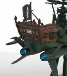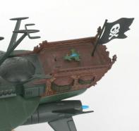 Le moulage est incroyablement abouti, les joints son dissimulés avec intelligence et le moindre petit détail est présent. Rien ne manque que ce soit la barre sur la nacelle arrière ou le Z métallique à l’avant, tout a été pensé et fait avec passion. Deux ouvertures latérales permettent d’accrocher les chaînes des ancres. Il est d’ailleurs très surprenant que ces ancres ne reprennent pas le design futuriste de la série. Elles font penser à de vulgaires grappins. Ce détail détonne beaucoup avec le reste du vaisseau qui se veut très respectueux de l’œuvre de Leiji Matsumoto.