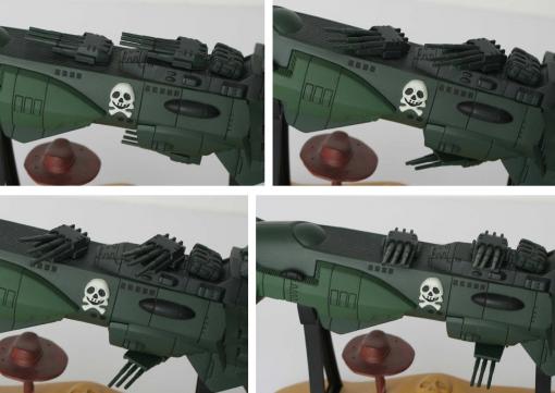 Les deux plateformes des Spacewolfs sont aussi trop présentes et nuisent à la mise en valeur de l’Arcadia. Il aurait été plus judicieux de mouler sur le socle des plateformes d’atterrissages pour les disposer. Ainsi, ils seraient visuellement mieux ressortis au lieu d’être écrasés par la proximité de l’aile gauche de l’Arcadia.