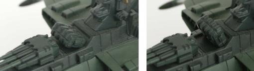 Les plus attentifs auront remarqué que sur les photos de cet article, certains clichés ne montrent pas les socles des Spacewolf. En effet nous avons retiré ce socle pour faire nos photos car cette protubérance est du plus mauvais goût et détonne avec la finition du vaisseau. Cependant, ne vous imaginez pas que cette pièce est emboîtable et déboîtable à loisir. Elle est soudée au socle, pour la retirer, nous avons dû la casser.