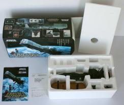 En revanche la version bleue ci-dessous ne correspond à aucune série. Elle fait probablement référence à la teinte bleue de l’Atlantis dans Albator 78, mais dans cette série le design n’a rien à voir avec celui de ce jouet car il proche de celui du Death Shadow 2. Conscient de la faiblesse de ce modèle, le fabriquant a rajouté deux personnages, Albator et Toshirô pour réhausser l’intérêt de cette version et attirer les collectionneurs.