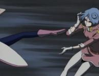 Marina a été assommée par le souffle de l’explosion provoquée par le dispositif laissé par la mystérieuse Hell Maetel. L’équipage arrive pour éteindre l’incendie mais ne peut entrer dans la fournaise. Warius ne peut se résoudre à laisser Marina au milieu des flammes et tente d’aller la chercher seul. Il finit par la trouver, à moitié inconsciente. La chaleur a endommagé son corps mécanique qui est à présent mis à nu. Heureusement pour Warius, une fois qu’il a trouvé Marina, le système anti incendie se met en marche et éteint le feu (ça fait bien 10 minutes que c’est la fournaise et qu’il y a des explosions partout, mais le système anti incendie a gentiment attendu que Warius joue au héro pour s’enclencher… ça sent vraiment le scénario au rabais…).