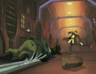 Profitant de la confusion provoquée par l'explosion du canon, Warius assomme ses gardiensSur cette image on voit bien le bouchon et le canon explosé du fusil