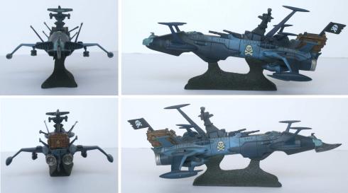 Même la version de haute qualité métallique d’Aoshima fait l’erreur car ils ont simplement peint en bleu le modèle de Cosmowarrior Zero, sans revoir le design de l’avant. Cette miniature en résine de Mabell est donc une des rares versions fidèles à la série TV d’Albator 78. Notons aussi que même si il s’appelle Death Sahdow sur l’emballage, il s’agit en réalité de l’Arcadia n°5 (voir fiche du vaisseau)