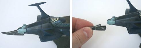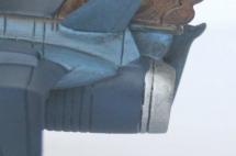 Le moulage est excellent on retrouve bien l’Atlantis, aussi bien dans la forme générale du vaisseau que dans les détails de finition. Quelques légers défauts sont cependant perceptibles comme la tête de mort latérale qui est assez grossière et les réacteurs qui ne sont pas assez effilés. La peinture de ses derniers mériterait aussi un meilleur traitement notamment à l’intérieur. Le gris uniforme passe assez mal.