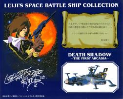 Ce vaisseau fait partie de la collection « Leiji’s Space ship ». Lorsqu’on compare le Death Shadow à l’Arcadia, on constate que les tailles sont similaires, en revanche, il est plus long que le Queen Emeraldas alors que ce dernier est sensé être plus grand que lui. Mais ce problème d’échelle ne vous empêchera pas d’apprécier ce jouet. Notons toutefois que le fabriquant Aoshima n’a pas fait cette erreur d’échelle en éditant des versions métalliques des ces trois vaisseaux, le Queen Emeraldas est beaucoup plus grand que les deux autres (voir l’article : comparaisons entre les trois vaisseaux).