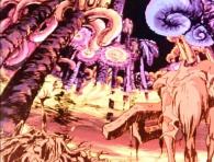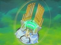 Dans la série TV c’est Freia qui en joue de l’orgue en s’échappant, mais elle ne réussit pas à calmer le dragon et la forteresse est détruite par deux frères géants du Riesenheim pour sauver l’Arcadia, cependant, l’explosion va tuer Albérich.