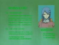 Warrius est très perturbé par Marina car elle ressemble trait pour trait à sa défunte épouse. Du coup, dans l’épisode 2, Warius consulte la fiche de Marina pour en savoir plus sur elle, on découvre alors son passé officiel : elle fut Diplômé de l’Ecole Militaire Galactique en l’an 256, elle a d’abord servi sur le destroyer Munsuri (prononcer Mounssouri), puis elle a rejoint l’état major et devient officier de défense de la planète Jupiter. Mais curieusement, elle demande à réintégrer a flotte et devient officier navigateur sur le Daisan. Elle est ensuite promue Capitaine (le grade militaire, et non pas commandant de vaisseau) puis Commandant en Second sur le croiseur Yû.