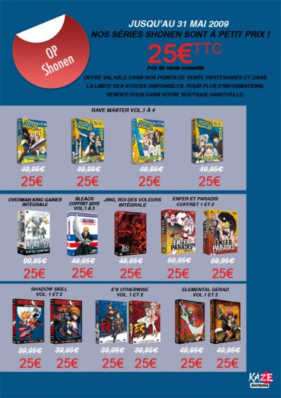 Du 20 au 31 Mai 2009, Kazé propose 50% de réductions sur une partie de son catalogue : Rave Master, Bleach, Enfer et Paradis, Overman King Gainer, Jing roi des voleurs, …